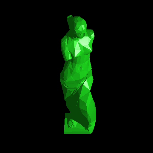 For Vertex Normal Interpolation, I import vertex normals from OBJ files, and use Barycentric Gouraud-style interpolation across the face of the imported triangle. The result is a very nice, smooth mesh rendering that is much more aesthetically pleasing and professional than the faceted look. Venus De Milo mesh, no interpolation
